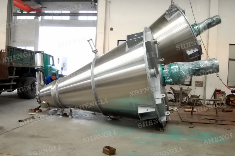 描述:螺旋混合機內部安裝非對稱傾斜螺旋,雙螺旋自身旋轉,提升物料,并有公轉減速箱驅動,沿錐體中心軸公轉,360度攪拌物料,擁有非破壞性攪拌以及快速且無殘留卸料的特點。該設備配置內加熱夾套,內外表面做拉絲處理,筒體底部配置氣動閘閥,開設投料口、排氣口等。