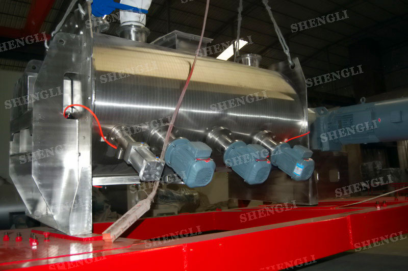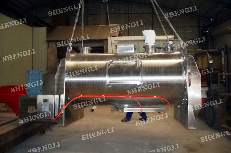 工作原理:犁刀式混料機采用臥式圓柱筒體,內設平行主軸,主軸上安裝若干犁式刀頭,通過較快的旋轉速度,分割、重合物料,實現快速攪拌的功能,常結合1500-3000轉高速剪切飛刀相互作用。