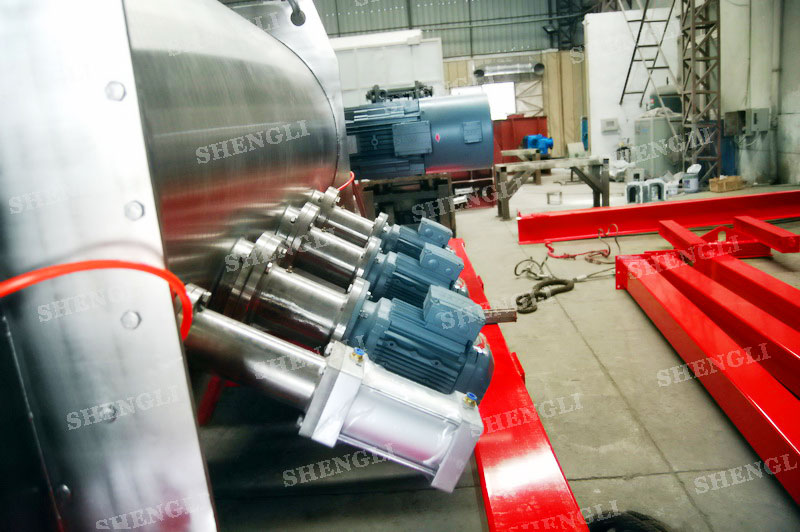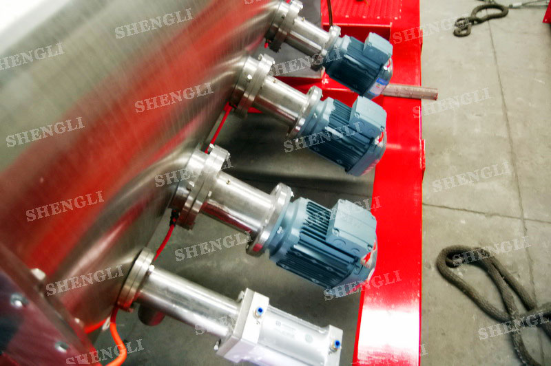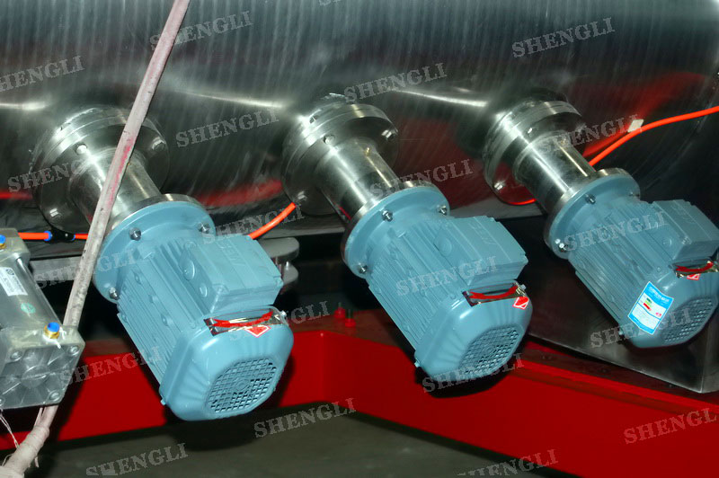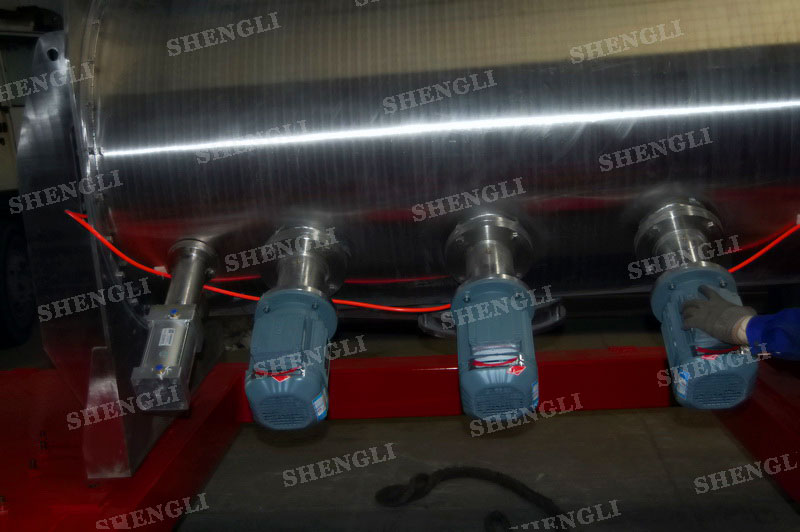 設備配置:配置SEW變頻電機K系列減速機,直角安裝;搭載三臺3000轉每分鐘的高速飛刀;開設快開式檢修門;出料口采用氣動錯位閥;主軸與飛刀主軸采用氣密封;筒體上設氣動在線取樣閥;設備內表面鏡面拋光、外表面拉絲亞光。
