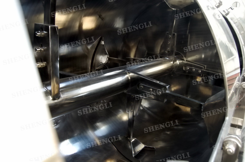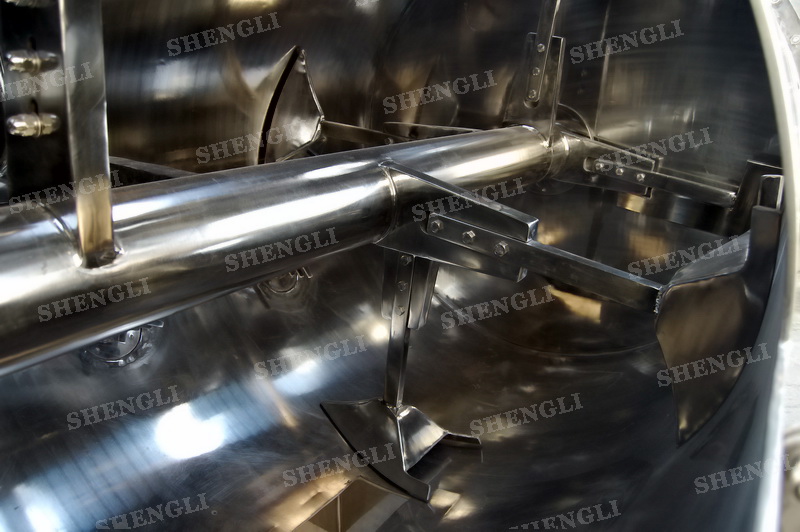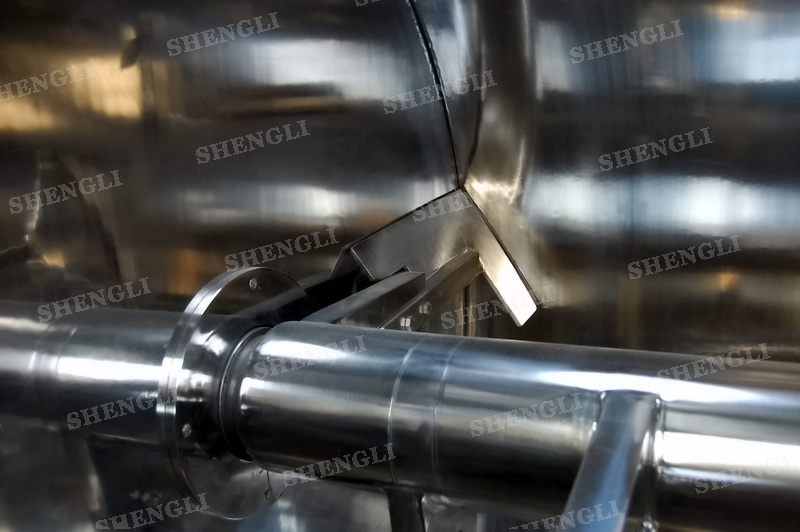 工作原理:犁刀攪拌機采用臥式圓柱筒體,內設平行主軸,主軸上安裝若干犁式刀頭,通過較快的旋轉速度,分割、重合物料,實現快速攪拌的功能,常結合1500-3000轉高速剪切飛刀相互作用。