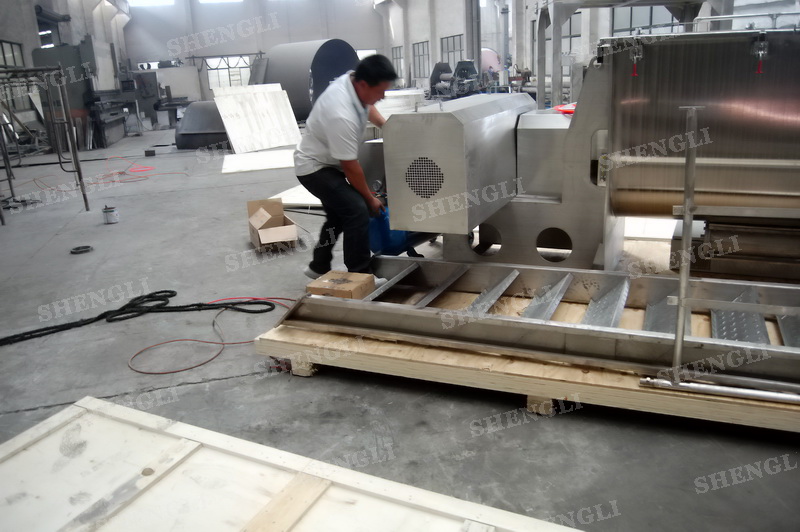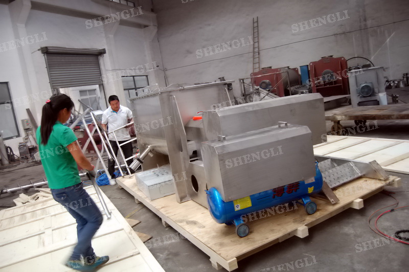 工作原理:螺帶式混合機采用U型筒體,內裝平行主軸,主軸上安裝正反雙向的盤條螺帶,不同維度螺帶分內螺帶與外螺帶,物料在螺帶的驅使下反復參混,能夠快速高效的混合。
