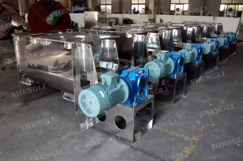 工作原理:臥式螺帶混合機采用U型筒體,內裝平行主軸,主軸上安裝正反雙向的盤條螺帶,不同維度螺帶分內螺帶與外螺帶,物料在螺帶的驅使下反復參混,能夠快速高效的混合。