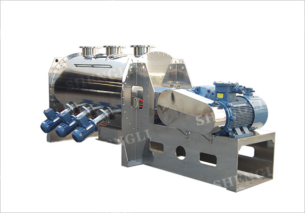 犁刀式混料機為單軸式強制攪拌設備,主軸上安裝有多組犁刀式攪拌器,并且錯位連續安裝,結構上避免了攪拌死角,運轉時,更產生了不間斷式的漩渦離心作用力,錯位的犁刀持續攪拌,漩渦離心物料流不斷重疊、擊散,致使物料沸騰,并行成對流循環,快速的攪拌物料。 結團性物料如纖維或受潮結團、加液凝聚的粉料,通過在犁刀混料機內安裝的高速飛刀,結合犁刀攪拌器攪拌物料時形成的對流循環作用,對結團性物料進行打散、分離。 高速飛刀安裝于犁刀混料機筒側向下45度角,刀頭伸入筒內,在攪拌時,物料受犁刀驅趕至飛刀有效范圍,受飛刀高速剪切。